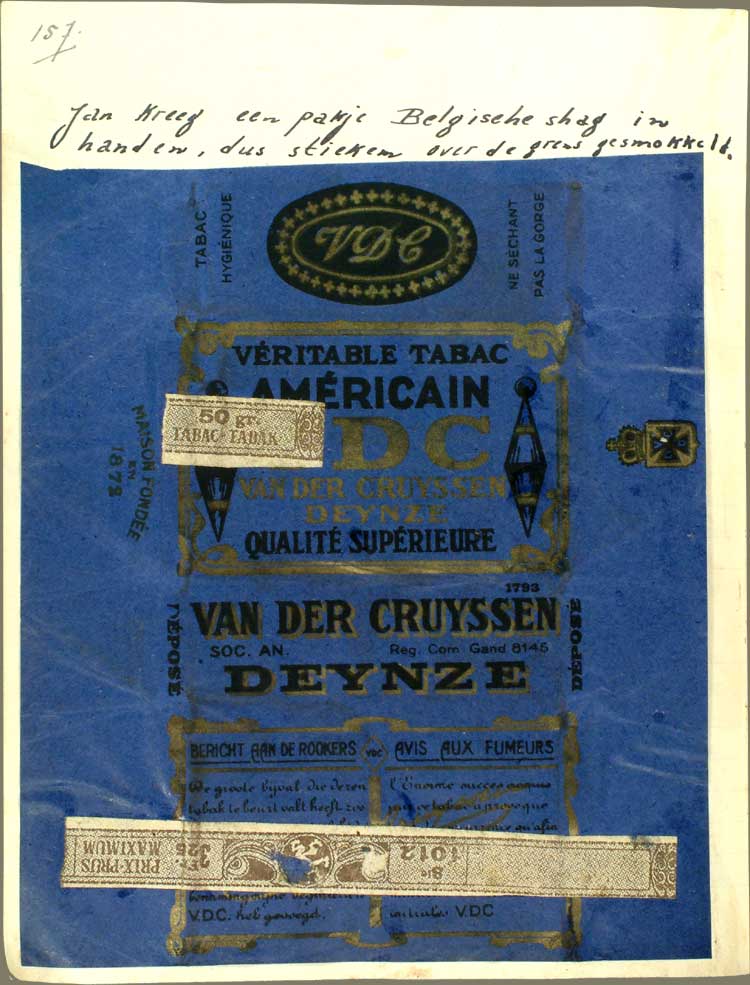 Jan kreeg een pakje Belgische shagOorlogstabak van slechte kwaliteit, vaak uit Belgiƫ afkomstig. in handen, dus stiekem, over de grens gesmokkeld.