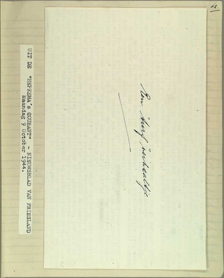 Uit de "Hepkema's CourantEen krant die naar de eigenaar is genoemd. Tijdens de oorlog is zij blijven bestaan en heeft dus ten dele met de Duitsers mee moeten werken. - Nieuwsblad van FrieslandKrant die To af en toe gebruikt in haar oorlogsschriften.