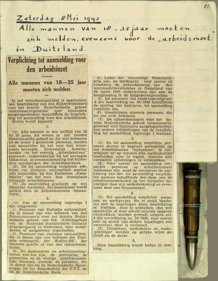 Zaterdag 8 Mei 1943 Alle mannen van 18 - 35 jaar moeten zich melden, eveneens voor de "arbeidsinzet" in Duitsland.