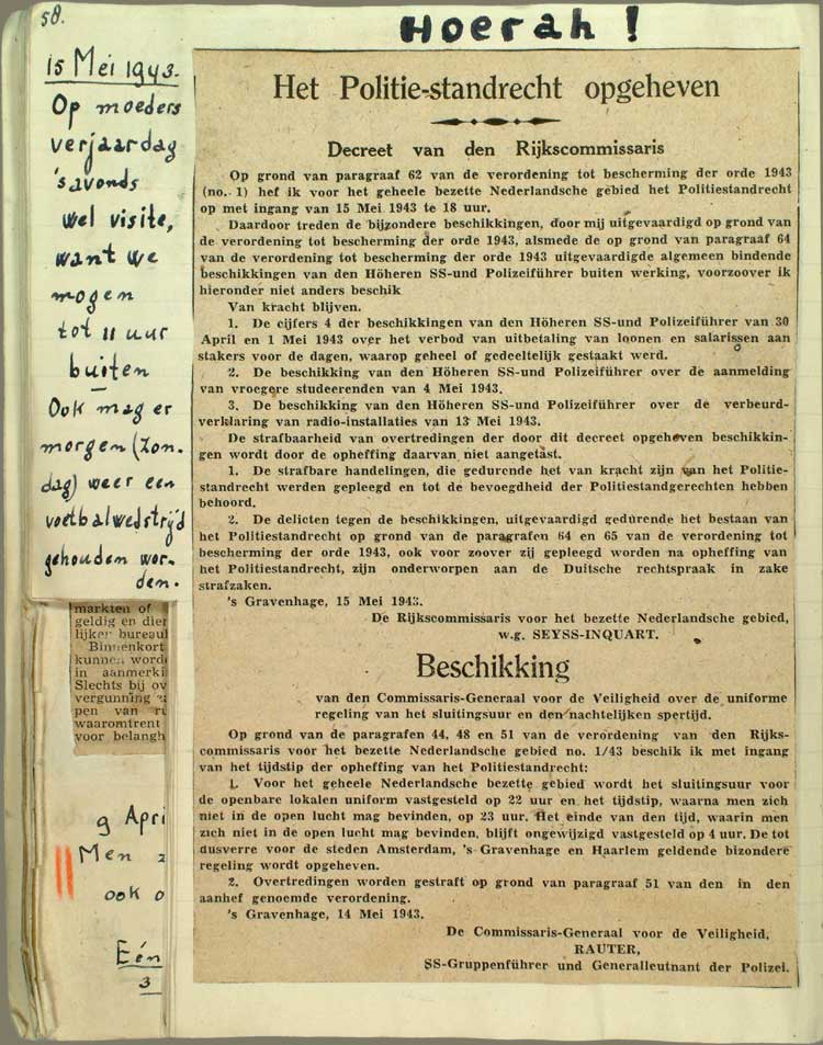 Hoera! 15 Mei 1943 Op moeders verjaardag 's avonds wel visite, want we mogen tot 11 uur buiten. Ook mag er morgen (Zondag) weer een voetbalwedstrijd gehouden worden.