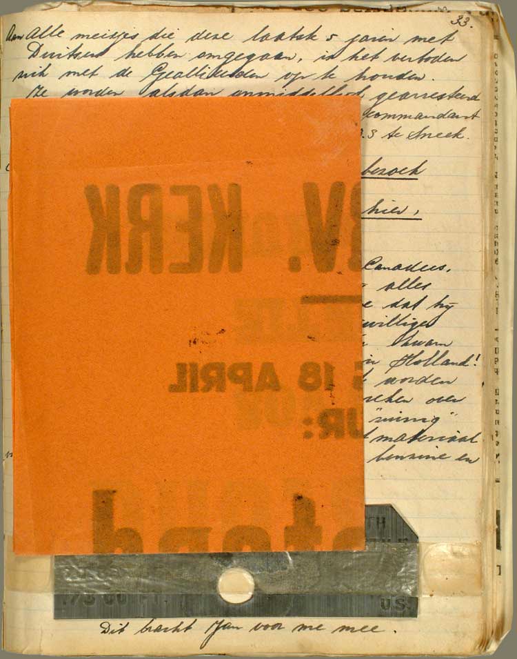 Twee leden van de ondergrondseHiermee wordt het verzetHet verzet tegen de Duitse bezetter, gedurende de Tweede Wereldoorlog. Onmiddellijk na de capitulatie op 14 mei 1940 ontstonden verzetsorganisaties en begon de verspreiding van illegale pamfletten en bladen. Op dit openlijke verzet reageerde de bezetter met arrestaties en het opleggen van collectieve geldboetes. Naarmate de onderdrukking harder werd, nam enerzijds het openlijk verzet af, maar groeide het illegale verzet. bedoeld, ook wel de Geheime Dienst of de Illegaliteit genoemd. hier